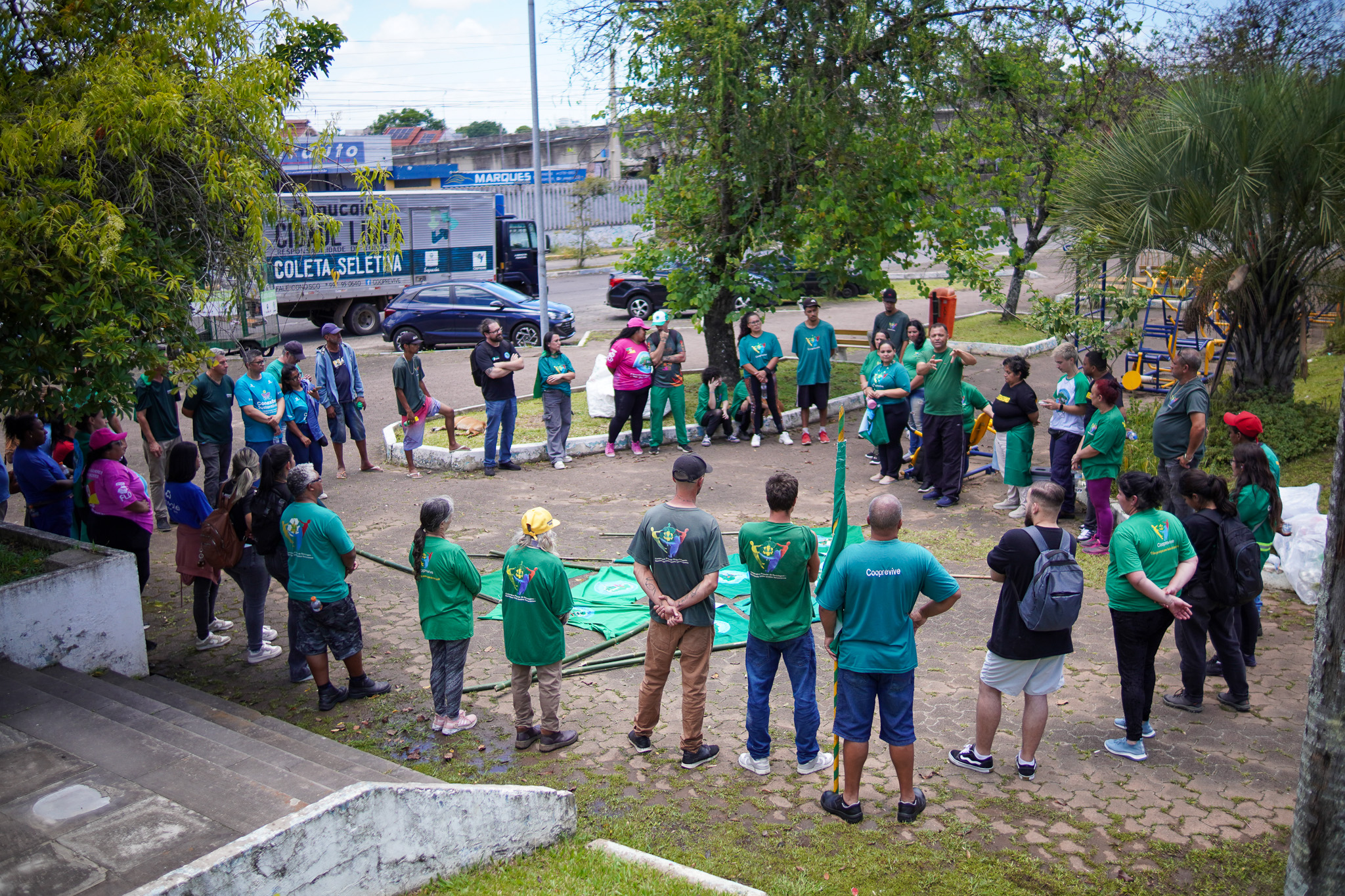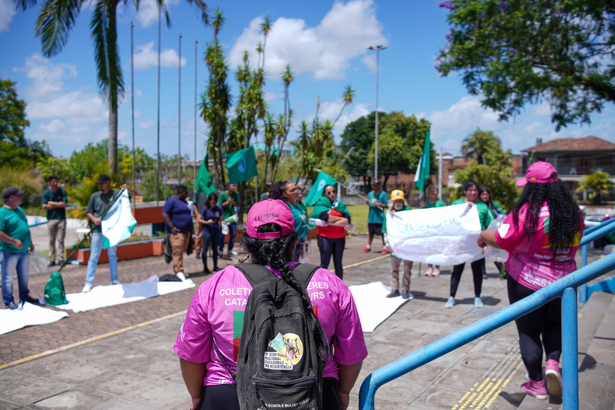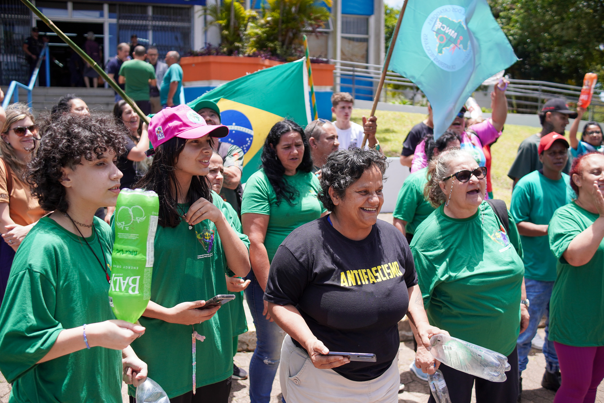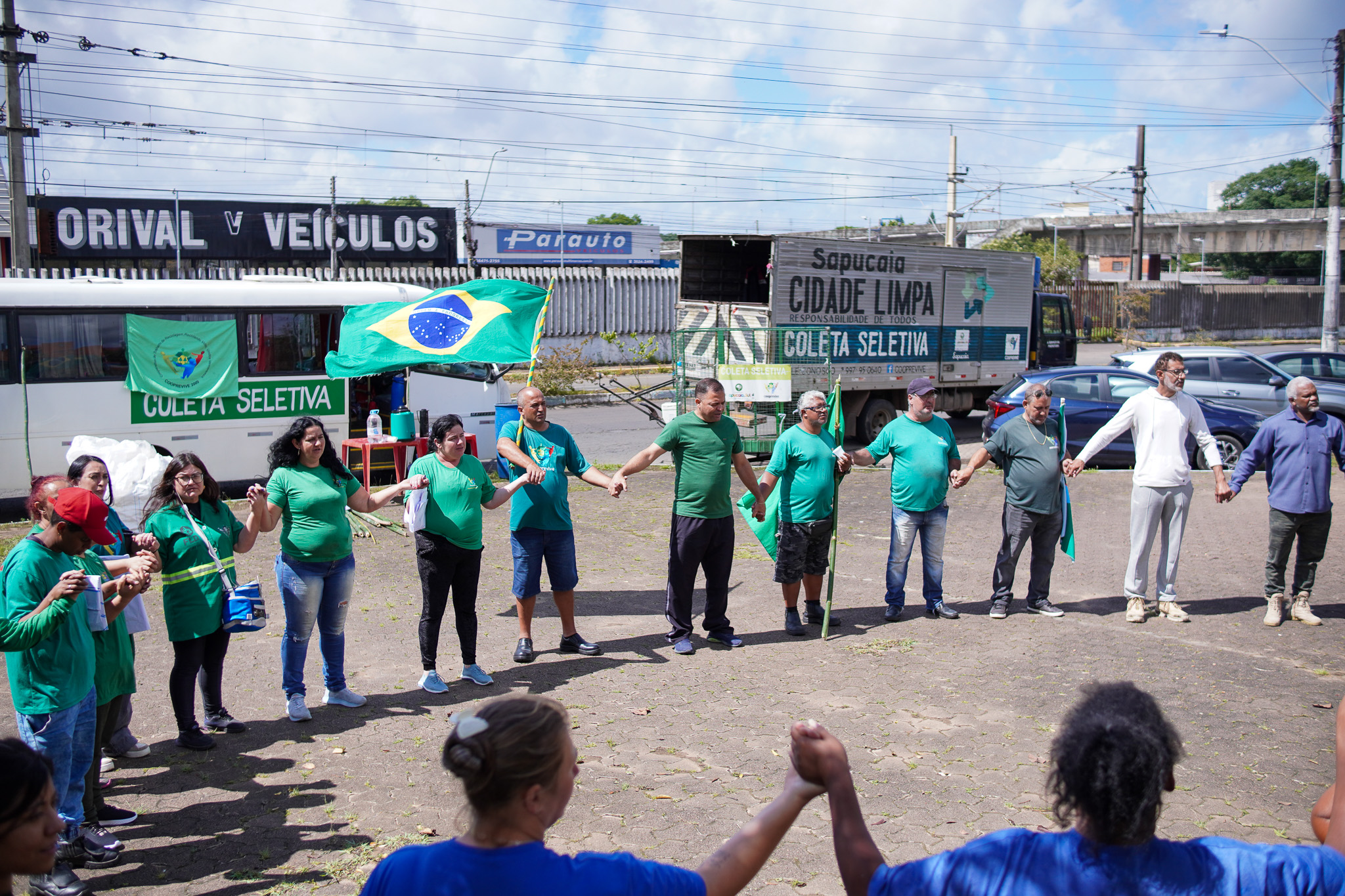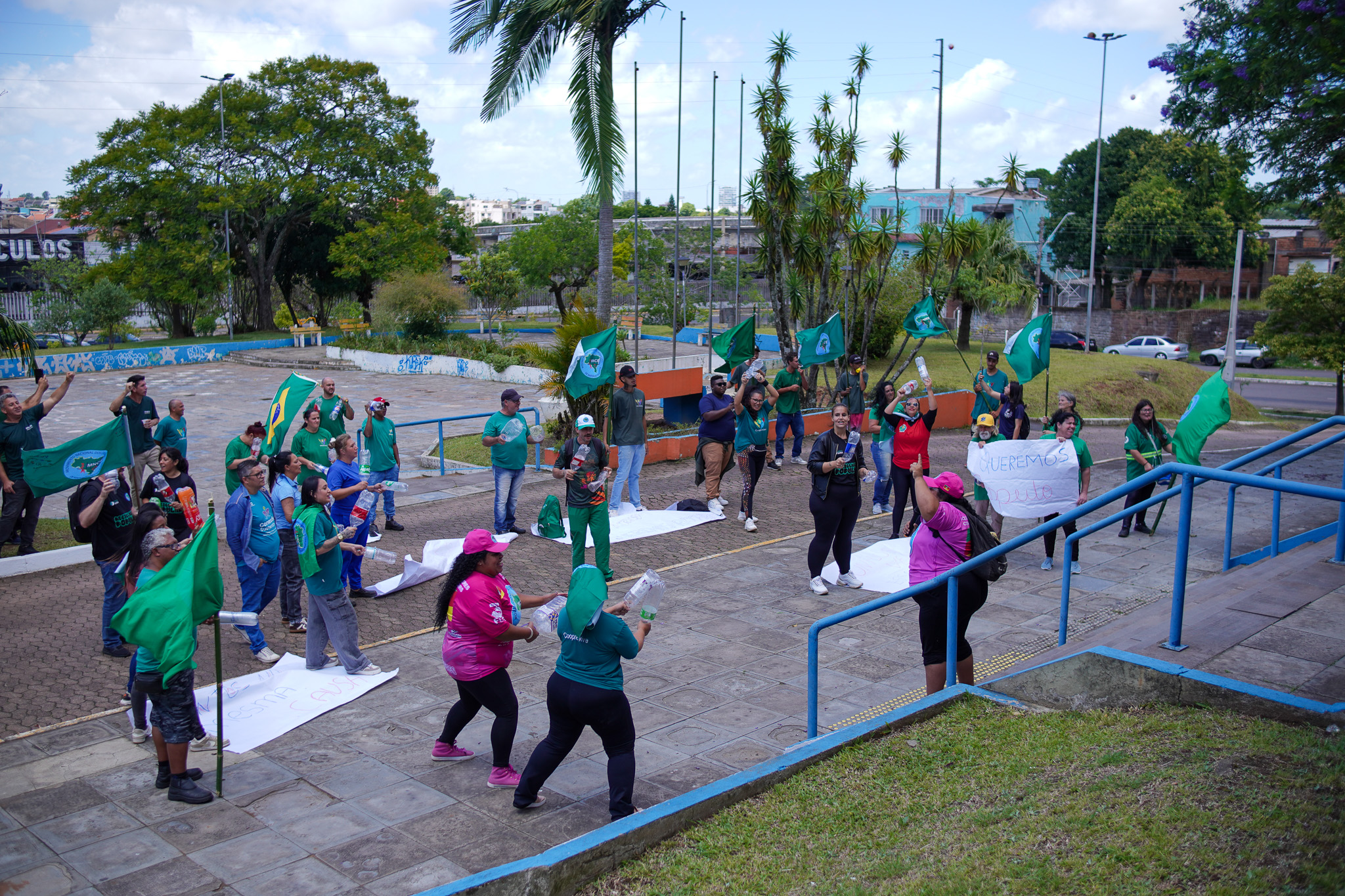 Na manhã do dia 11 de dezembro, cerca de 60 catadoras, catadores e apoiadores se reuniram em frente à Prefeitura de Sapucaia do Sul para protestar pela falta de pagamento à Cooperativa Cooprevive.